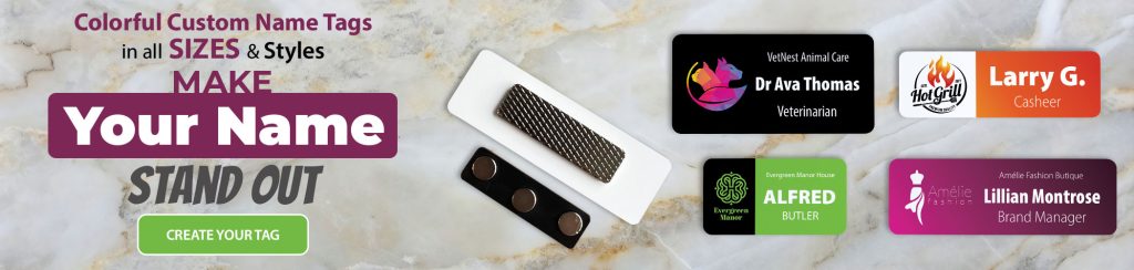 Colorful name tags with multiple back attachment options
