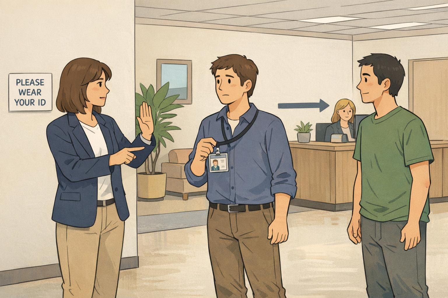 Focus on the process and the “why” (safety, clarity, fairness). Offer a clear next step—temporary badge, sign-in, supervisor verification—so the person doesn’t feel stuck.