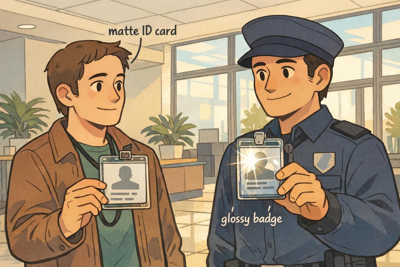 In plain terms, glossy and matte refer to how the card’s surface interacts with light. A glossy finish reflects light in a more mirror-like way. A matte finish scatters light more evenly. That difference changes what your eyes perceive when you look at a badge in real conditions—especially under ceiling LEDs, lobby lighting, and sun from windows.